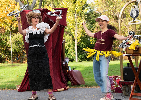 Mission menée par une drôle de dame et sa complice régisseuse circassienne. Tout un duo...Non, plutôt un trio car D’Ginette (jadis d’Gino le Lazyboy) est aussi une partenaire de jeu! Et quelques fois tout un quatuor car le public se prête au jeu et s’intègre à leur quotidien de tournée déjanté. Une mise en abîme, une vie sur les routes où tous les excès d’imaginaire sont permis!